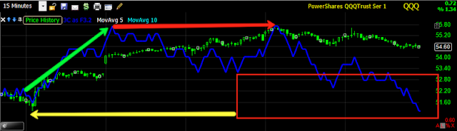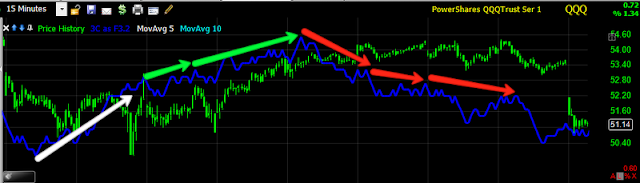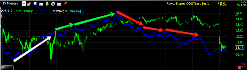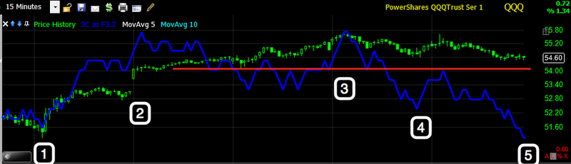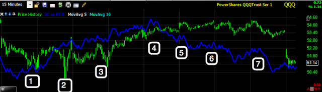 This Chart is from August Options Expiration, the move down was the Thursday decline. This is an example of a strong Relative divergence because it happens over a larger time period. Look at how high 3C is at point 1 and how much lower price is at point 1 then at point 2. The fact 3C didn’t move higher at point 2 with price, makes this a strong Relative Negative Divergence, it was briefly followed by a Negative Leading Divergence before the reversal down.